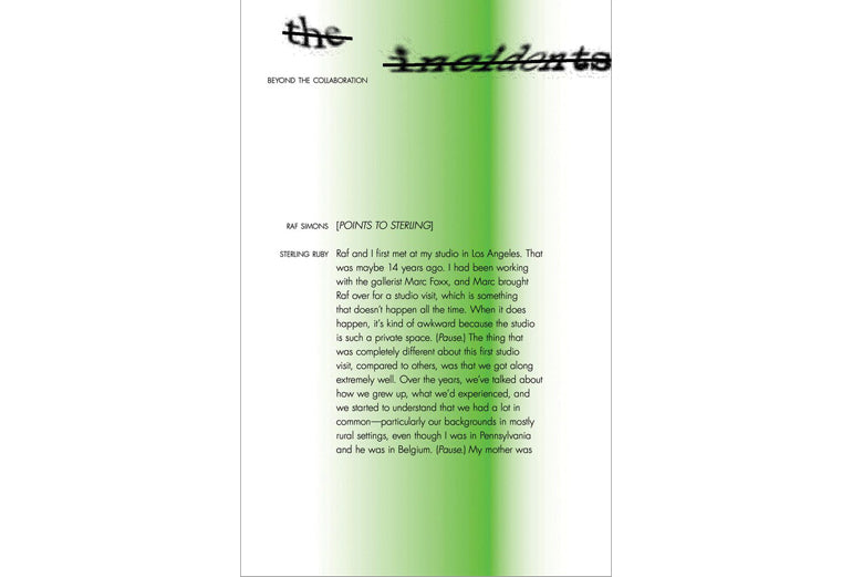 How do you tell the story of a friendship? How do you trace the roots of one of the most significant cross-disciplinary unions in fashion today? Artist Sterling Ruby and fashion designer Raf Simons did just that when they sat on stage with curator Jessica Morgan at the Harvard University Graduate School of Design. Offering complimentary perspectives on a bond that has matured over the span of a decade, and a body of work that transcends boundaries, Ruby and Simons spoke with mutual respect, trust, and a deep investment in the future. This is a story, and an exchange, that is beyond collaboration.