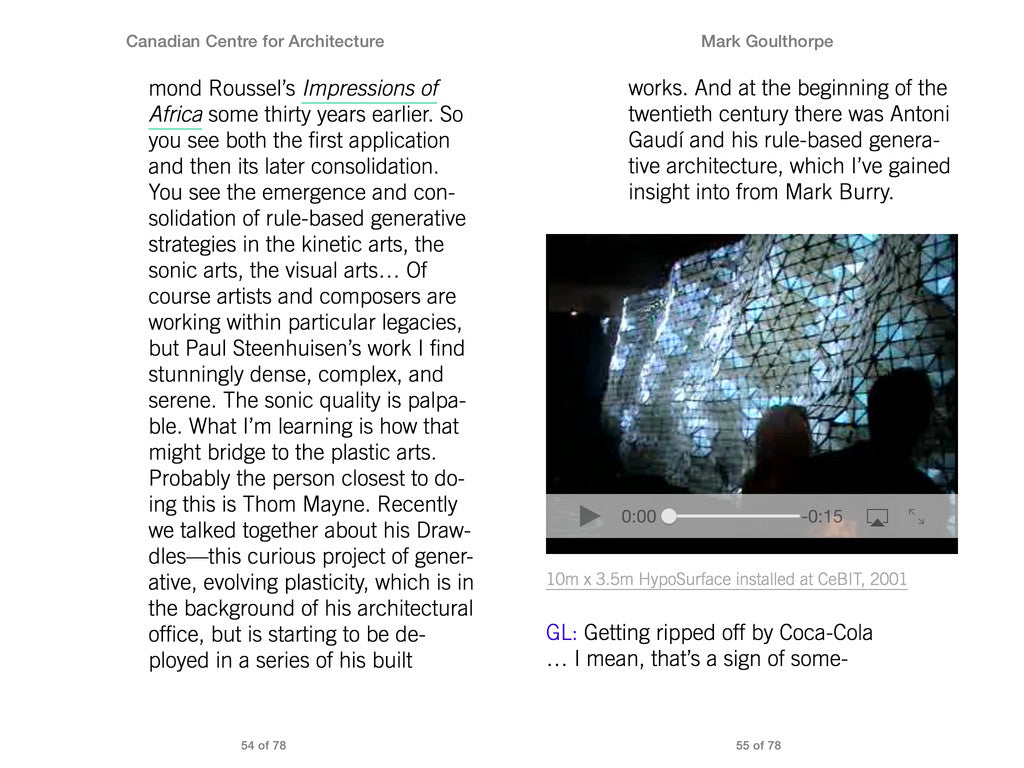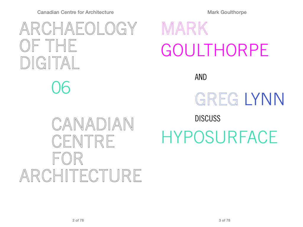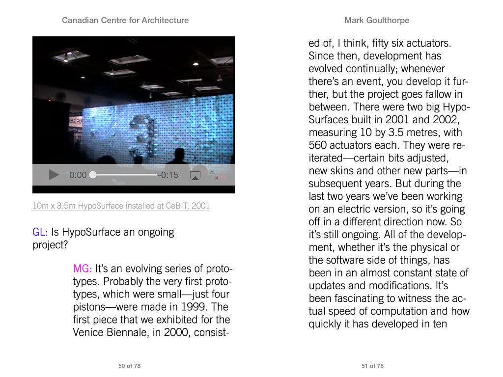 HypoSurface began in 1998 and is still under development. Lynn and Goulthorpe consider its origins, its many influences, as well as how an international team including designers, mathematicians, and a composer worked together over multiple iterations of the project.