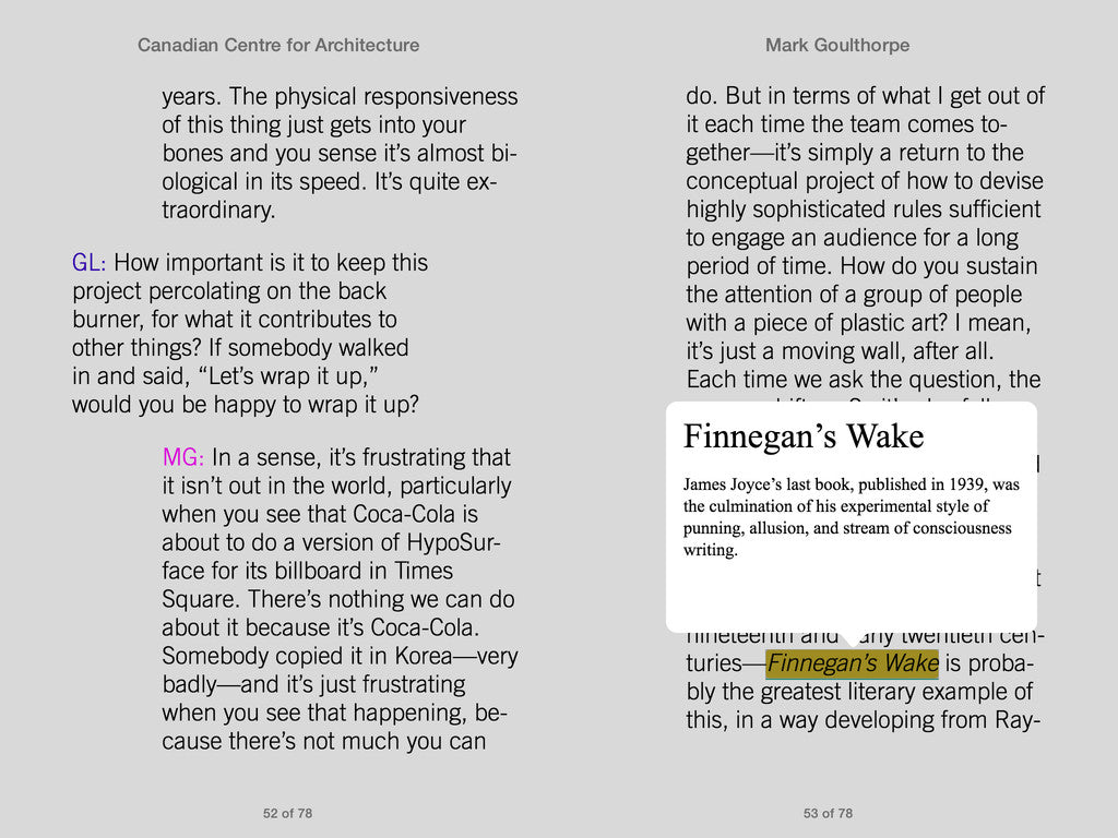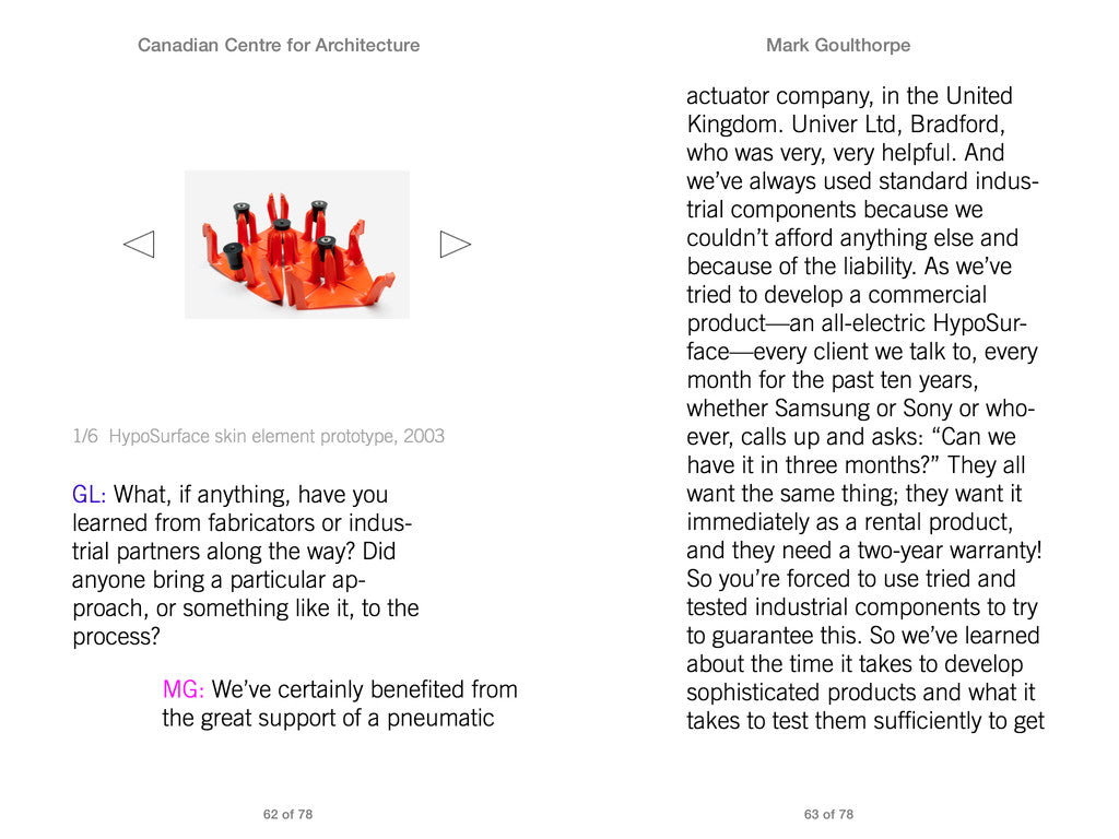 As part of a multiyear project that includes three exhibitions on twenty-five seminal projects, the CCA and Greg Lynn are publishing a series of digital publications recording conversations with key architects. The epubs are heavily illustrated with photos, drawings, renderings, videos, PDFs and interactive 3D models.