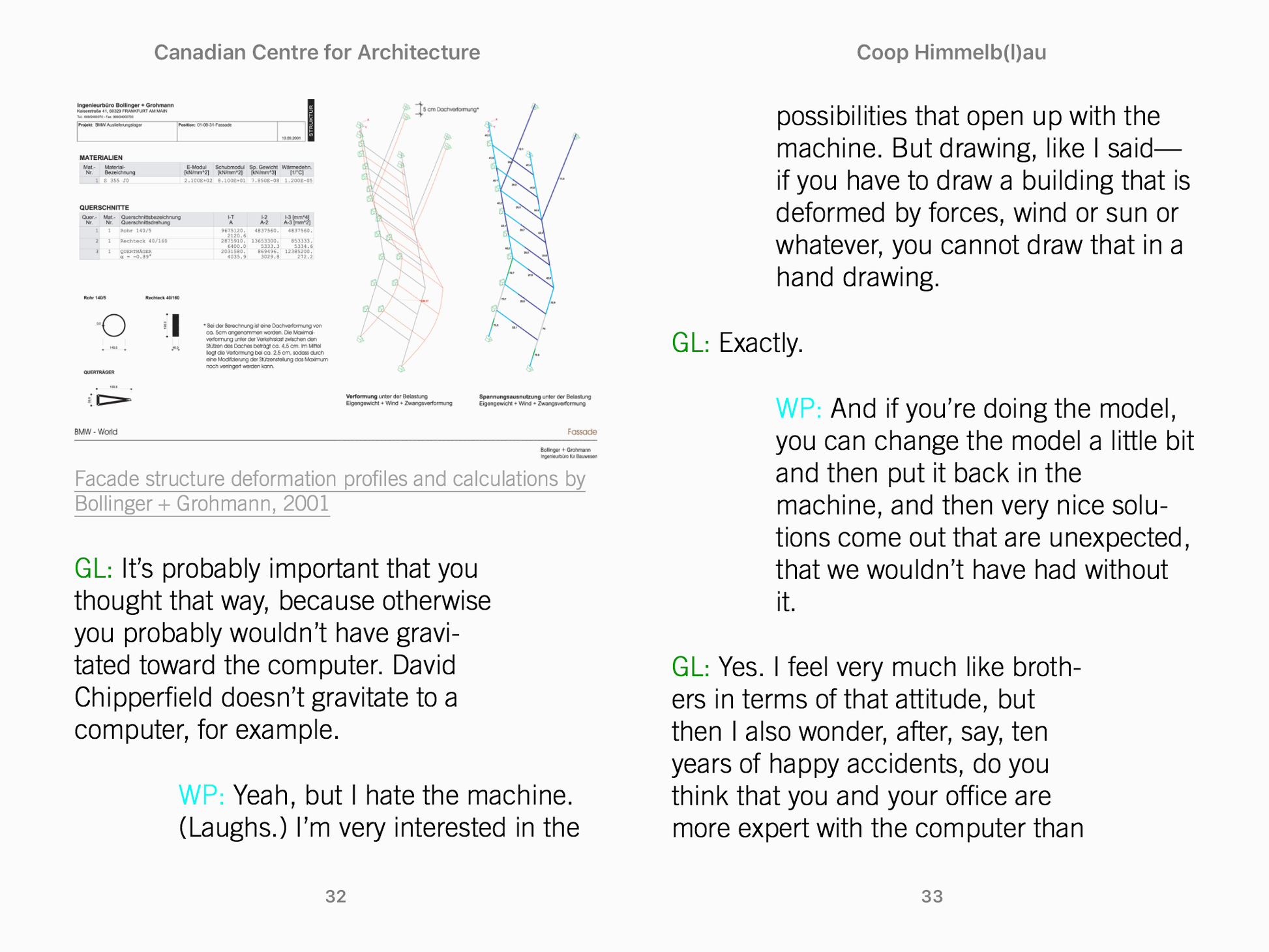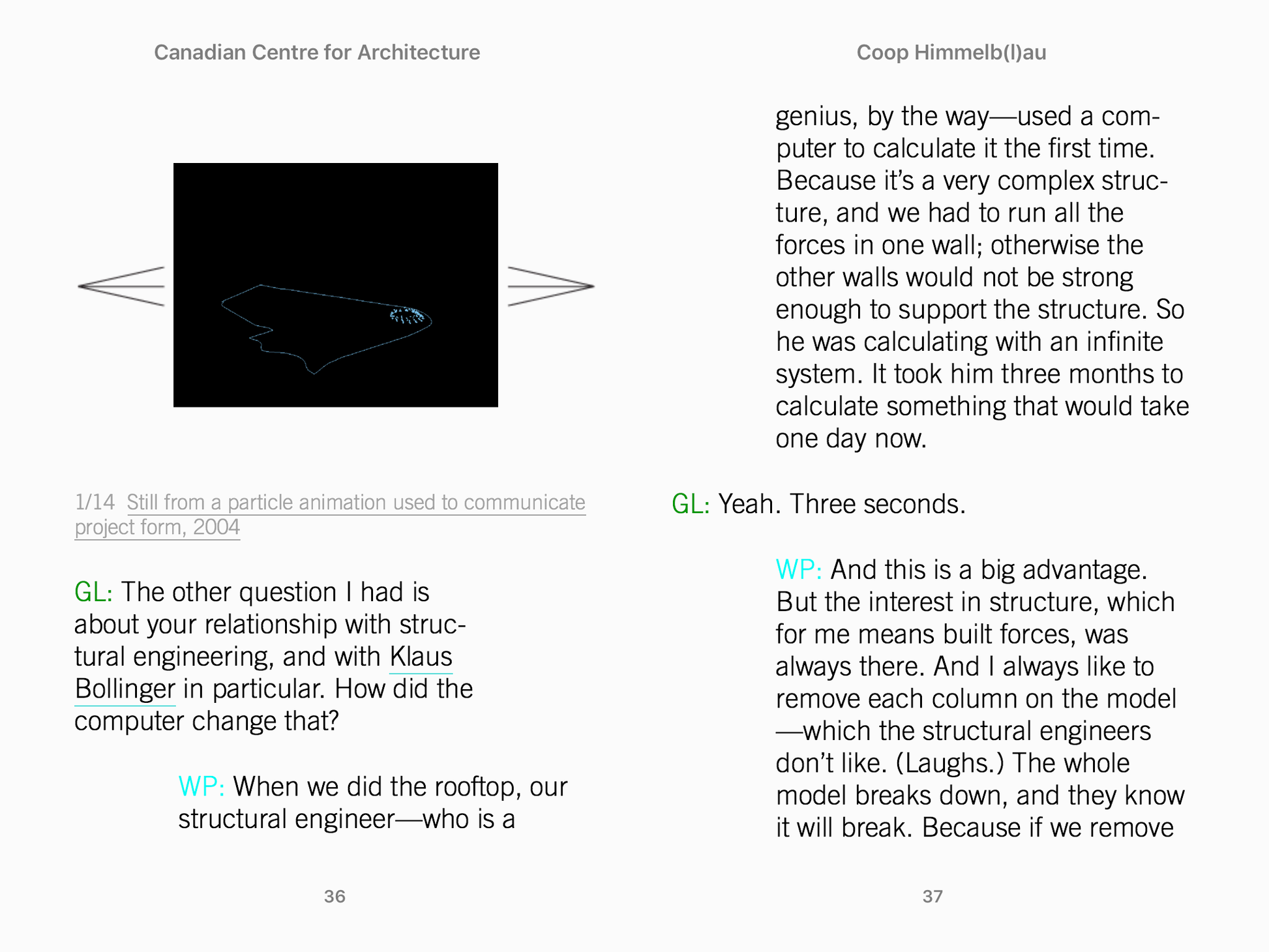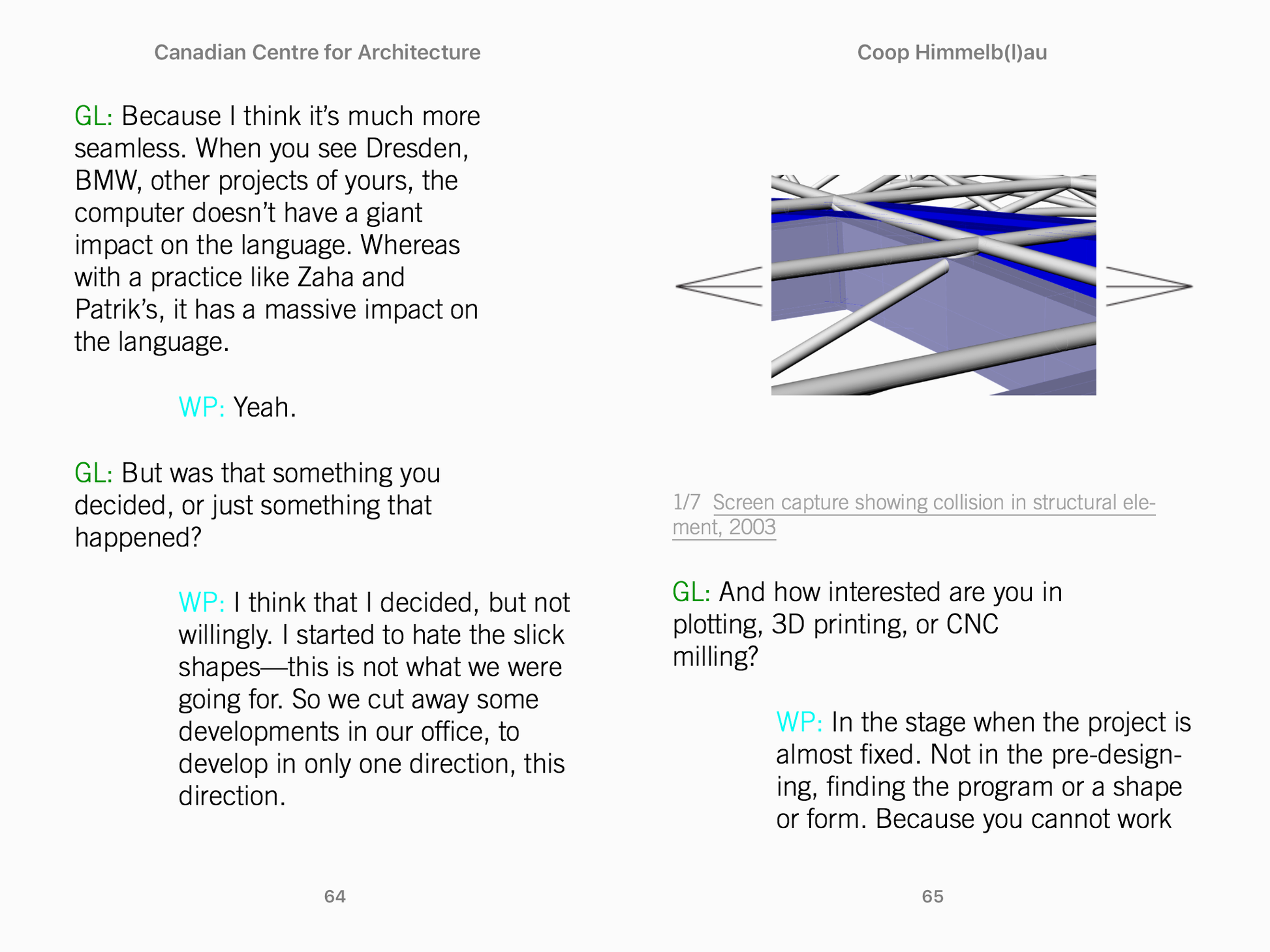 As part of the multi-year research, acquisition, and exhibition project Archaeology of the Digital, the CCA launched a digital publication series in 2014 consisting of small monographs of each of the twenty-five projects chosen by curator Greg Lynn for their contributions to the foundations of digital architecture. The ePubs are illustrated with photos, drawings, renderings, videos, PDFs, and interactive 3D models from the digital collection of the CCA. The series was published with the generous support of the Graham Foundation for Advanced Studies in the Fine Arts.