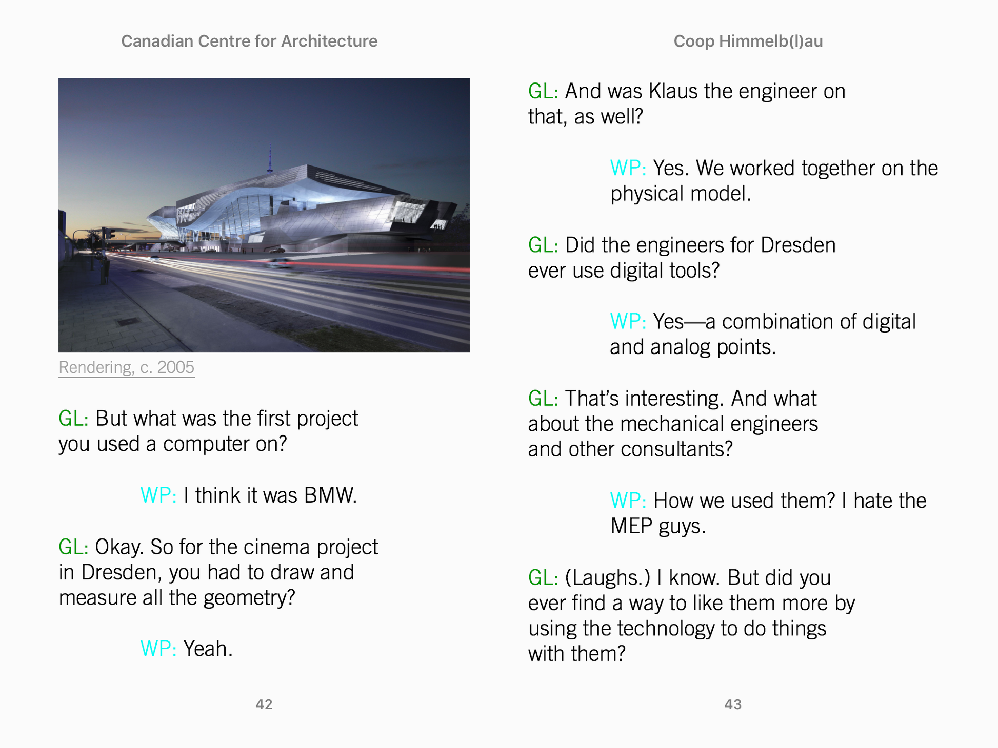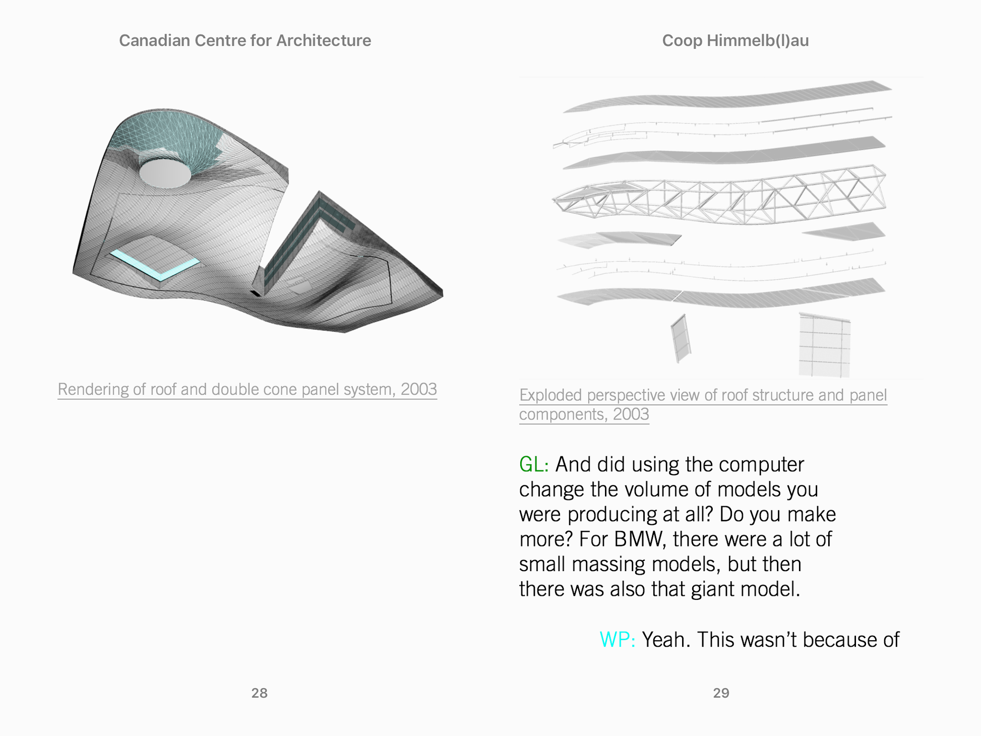 Beyond resolving structural issues, digital tools facilitated the form and reception of the project. Although the building’s easily recognizable profile originated in a sketch by Prix, design proceeded through an iterative loop where models would be shaped by hand, scanned three-dimensionally, adjusted in 3D software, and tested again by hand. To convince BMW, Prix also relied on rendering techniques that blended digital and analog, such as deploying digital projections within a physical model (as was the case for a six-metre-long model filmed by the Los Angeles–based creative services studio Imaginary Forces).
