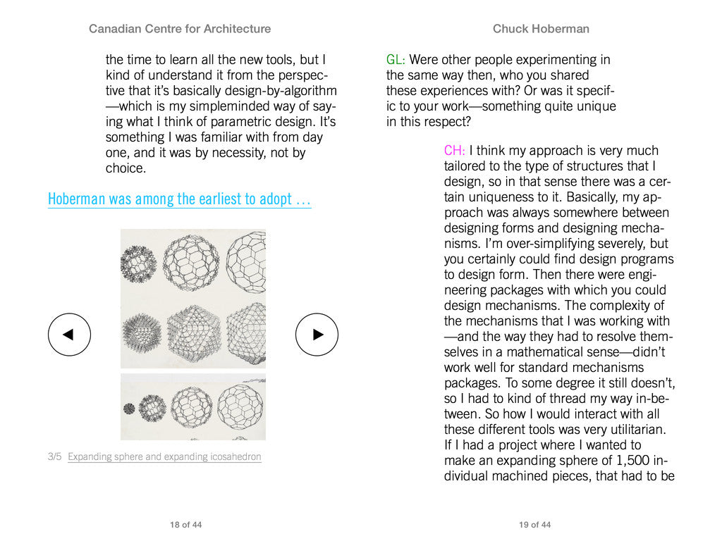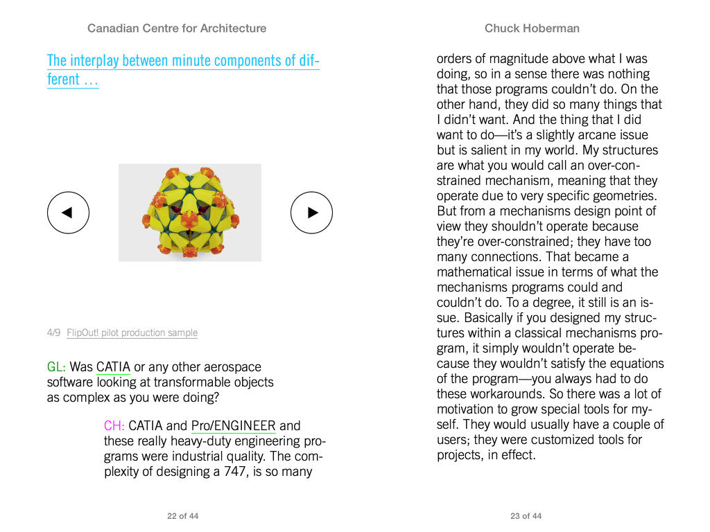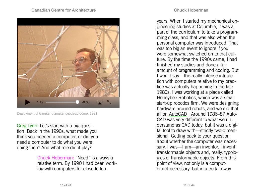 As part of a multiyear project that includes three exhibitions on twenty-five seminal projects, the CCA and Greg Lynn are publishing a series of digital publications recording conversations with key architects. The epubs are heavily illustrated with photos, drawings, renderings, videos, PDFs, and interactive 3D models.