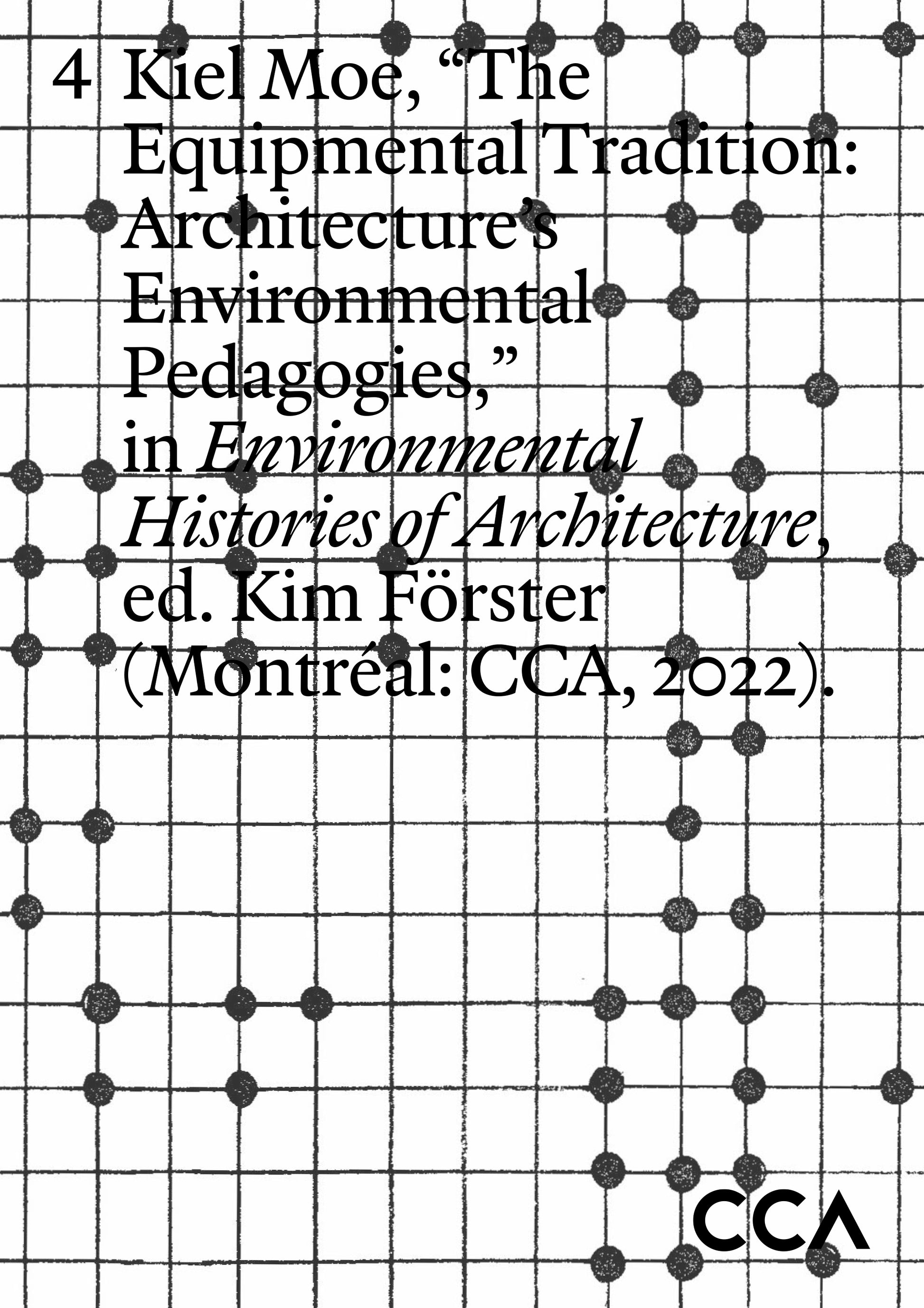 In Chapter 4, Kiel Moe argues that throughout the twentieth century, pedagogy in schools of architecture across North America constructed and maintained a bleak image of the environment as the very source of proprietary equipment. The essay traces this tradition from early curricula and textbooks, through course standardization and accreditation criteria, to the “Environmental Control System“ courses of the 1960s, which adopted the closed-systems thinking popularized by NASA as well as Reyner Banham’s take on mechanical services. Despite pedagogical alternatives offered by Lewis Mumford, James Marston Fitch, and Douglas Haskell, the focus on equipment was reinforced through close ties between industry and academia, leading to a path dependency that continues to dominate architecture curricula in North America.