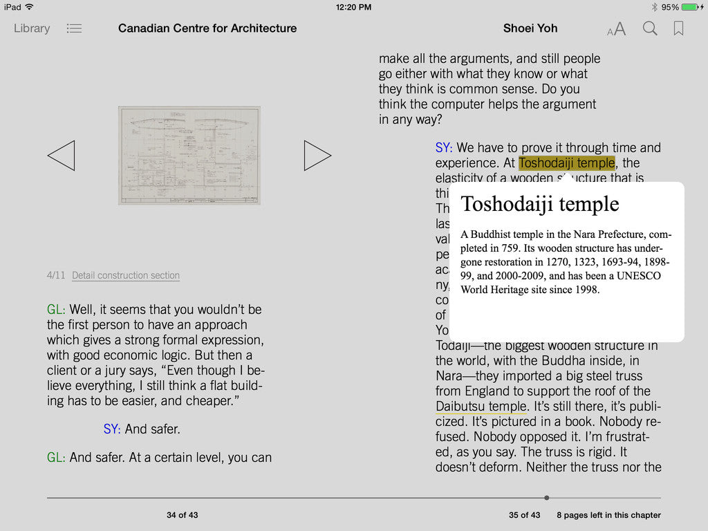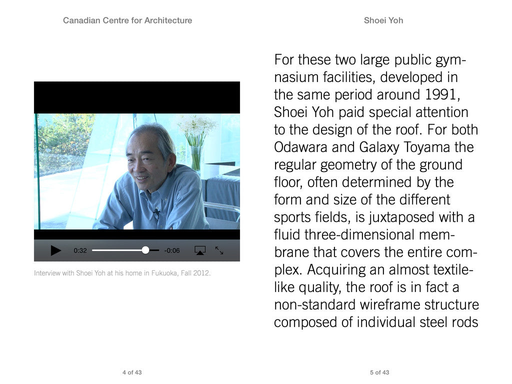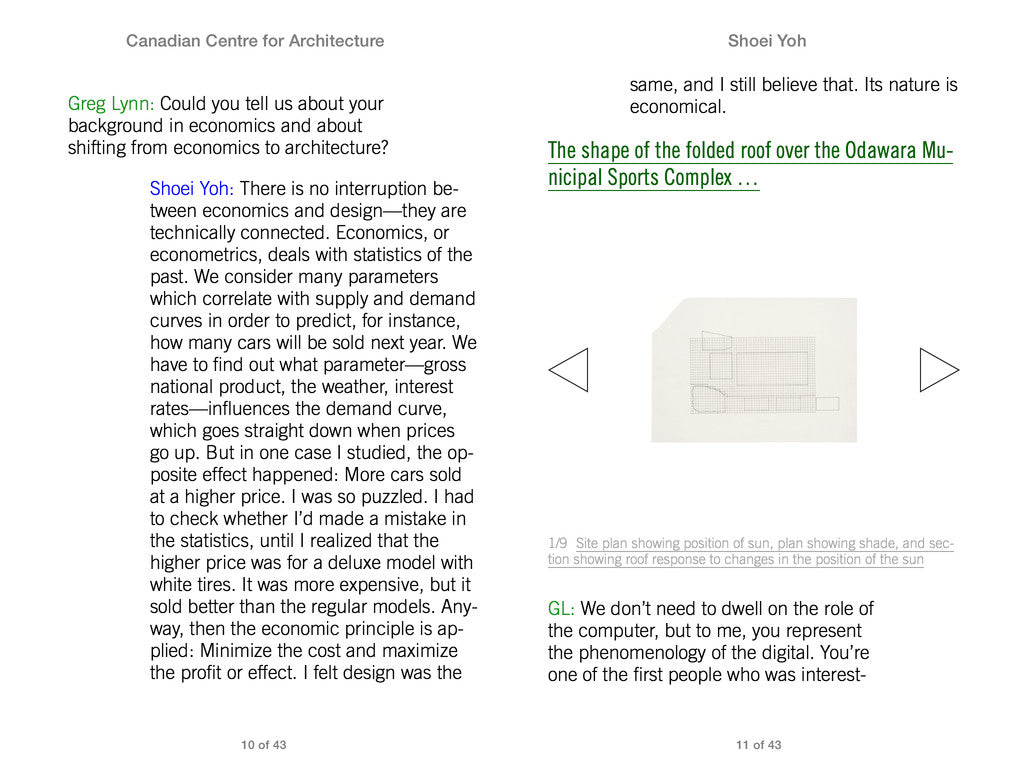 As part of a multiyear project that includes three exhibitions on twenty-five seminal projects, the CCA and Greg Lynn are publishing a series of digital publications recording conversations with key architects. The epubs are heavily illustrated with photos, drawings, renderings, videos, PDFs, and interactive 3D models.