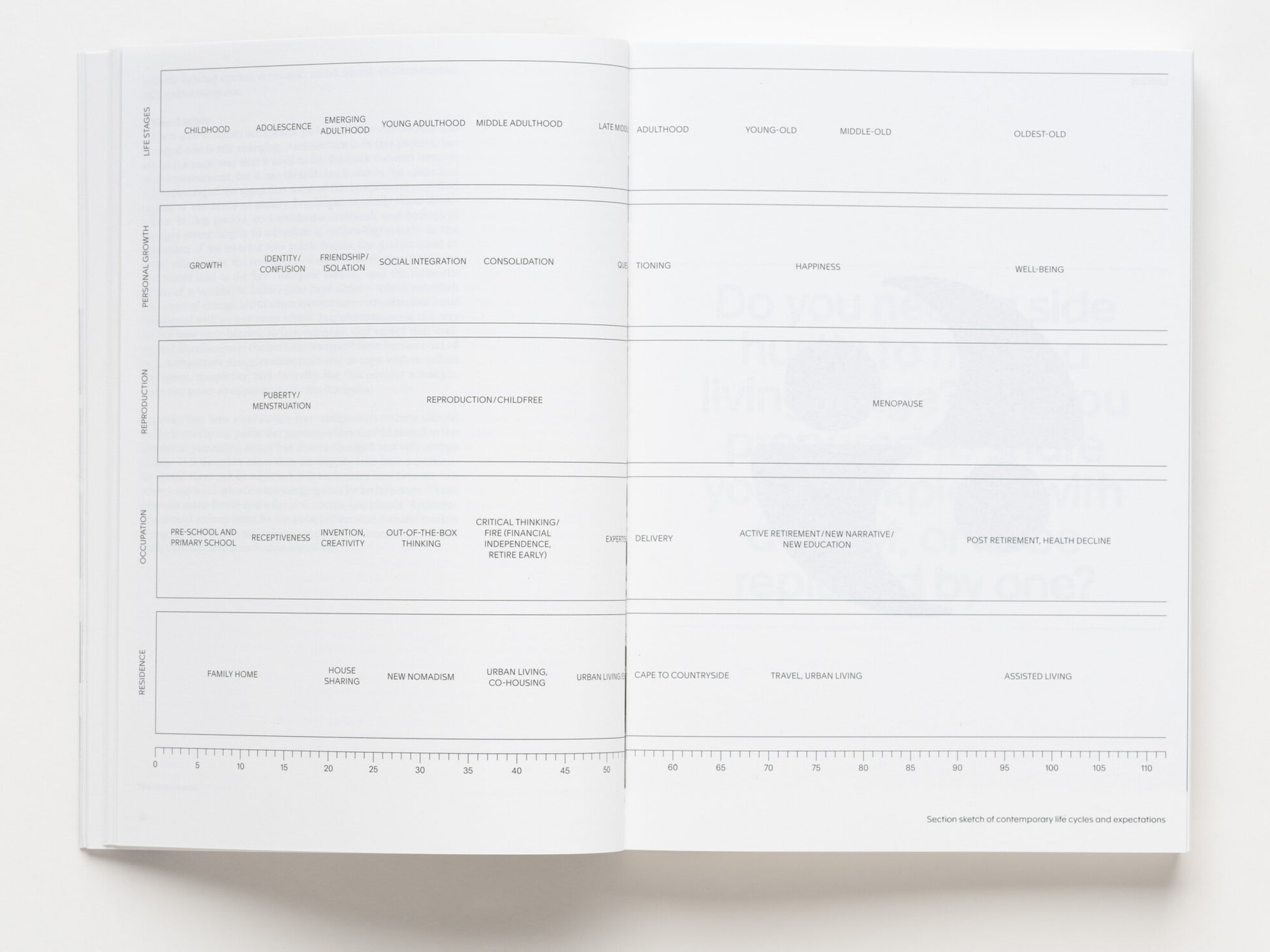 Conceived as part of the one-year investigation Catching Up with Life, A Section of Now aims to re-establish a dialogue between architecture and society that would allow for architecture to begin to contend with and address our changed and changing social norms. The publication serves as a meditation on new behaviours, rituals, and values and their spatial implications and seeks to catalyze urban and architectural interventions that accommodate, influence, and, in some cases, pre-empt our new lived realities. Authors address topics ranging from the safety of digital spaces to how normative life trajectories affect the elderly and the many selves each of us puts forward, while architects present frameworks for spaces for blended families, thirty-year-old retirees, and contested monuments, among many others.