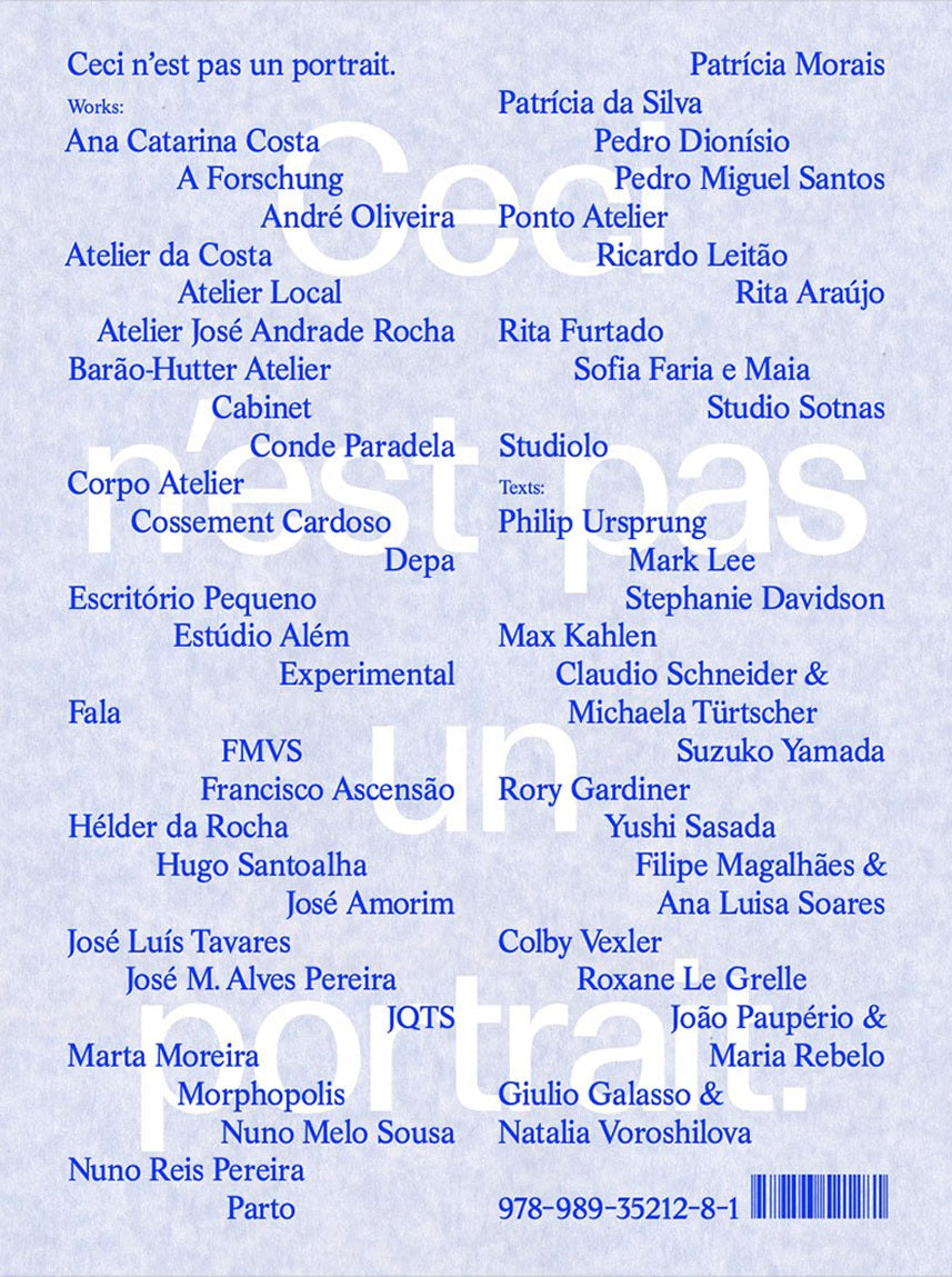 «Ceci n’est pas un portrait.» displays 333 photographs of 70 works by 40 different authors. The amount of works per author and the amount of photographs per work varies, but the overall presence of all authors and works is balanced, with no hierarchy or index: Ana Catarina Costa, A Forschung, André Oliveira, Atelier da Costa, Atelier Local, Atelier José Andrade Rocha, Barão-Hutter Atelier, Cabinet, Conde Paradela, Corpo Atelier, Cossement Cardoso, Depa, Escritório Pequeno, Estúdio Além, Experimental, Fala, FMVS, Francisco Ascensão, Hélder da Rocha, Hugo Santoalha, José Amorim, José Luís Tavares, José M. Alves Pereira, JQTS, Marta Moreira, Morphopolis, Nuno Melo Sousa, Nuno Reis Pereira, Parto, Patrícia Morais, Patrícia da Silva, Pedro Dionísio, Pedro Miguel Santos, Ponto Atelier, Ricardo Leitão, Rita Araújo, Rita Furtado, Sofia Faria e Maia, Studio Sotnas and Studiolo.