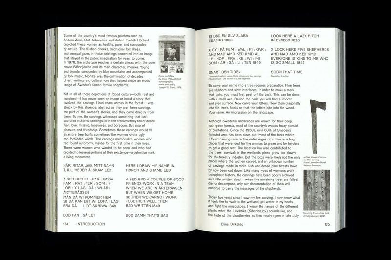 Deep in the woods in Dalarna, Sweden, scattered among stumps and newer-growth trees stand centuries-old Scotch pines – thick, gnarled, and covered with carvings. The messages inscribed in their trunks are from female shepherds who, from the 17th to the early 20th centuries, would leave their villages to live and work together on the fäbod (summer farm) and lead their families’ cattle out to graze. While in the pastures, these young women, many of them teenagers, carved the date, their initials, and notes to each other, leaving the trunks scrawled with a kind of teenage freneticism, a coded language, an assertion of their existence: HERE WE DRAW OUR NAMES.