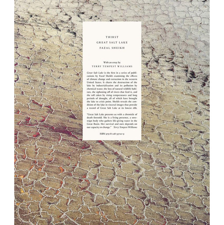 In November 2022, the water level of the Great Salt Lake fell to its lowest on record. Diverted water supply from its feeding rivers, pollution from nearby extraction plants and ravaging droughts have brought this landmark to a crisis point. As the lake reached its lowest ebb, photographer Fazal Sheikh (born 1965), together with writer Terry Tempest Williams (born 1955), walked the shoreline, awed by its epic beauty while recording the destruction of its natural habitats. As Utah native Williams writes in her essay, "Retreat," she is witnessing the death of a lake that has been a constant presence in her life. Meanwhile, Sheikh documents the shrinking salt basin from above, revealing how the lake has been exploited: plundered for its natural salts, dissected by concrete highways, discolored by toxic waste, depleted by evaporation. His images hold a mirror to the lake’s surface, charting its destruction while demanding the viewer’s visceral response.