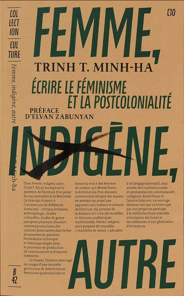 Dans Femme, indigène, autre, Trinh T. Minh-ha explore la question de l’écriture d’un point de vue postcolonial et féministe. Ce livre qui s’inscrit à l’intersection de différents domaines – critique littéraire, anthropologie, études culturelles, études de genre – juxtapose plusieurs discours contemporains issus des cultures dominantes dans le but de remettre en question l’orthodoxie stylistique et théorique exigée dans le processus de production de connaissances et d’oeuvres littéraires.